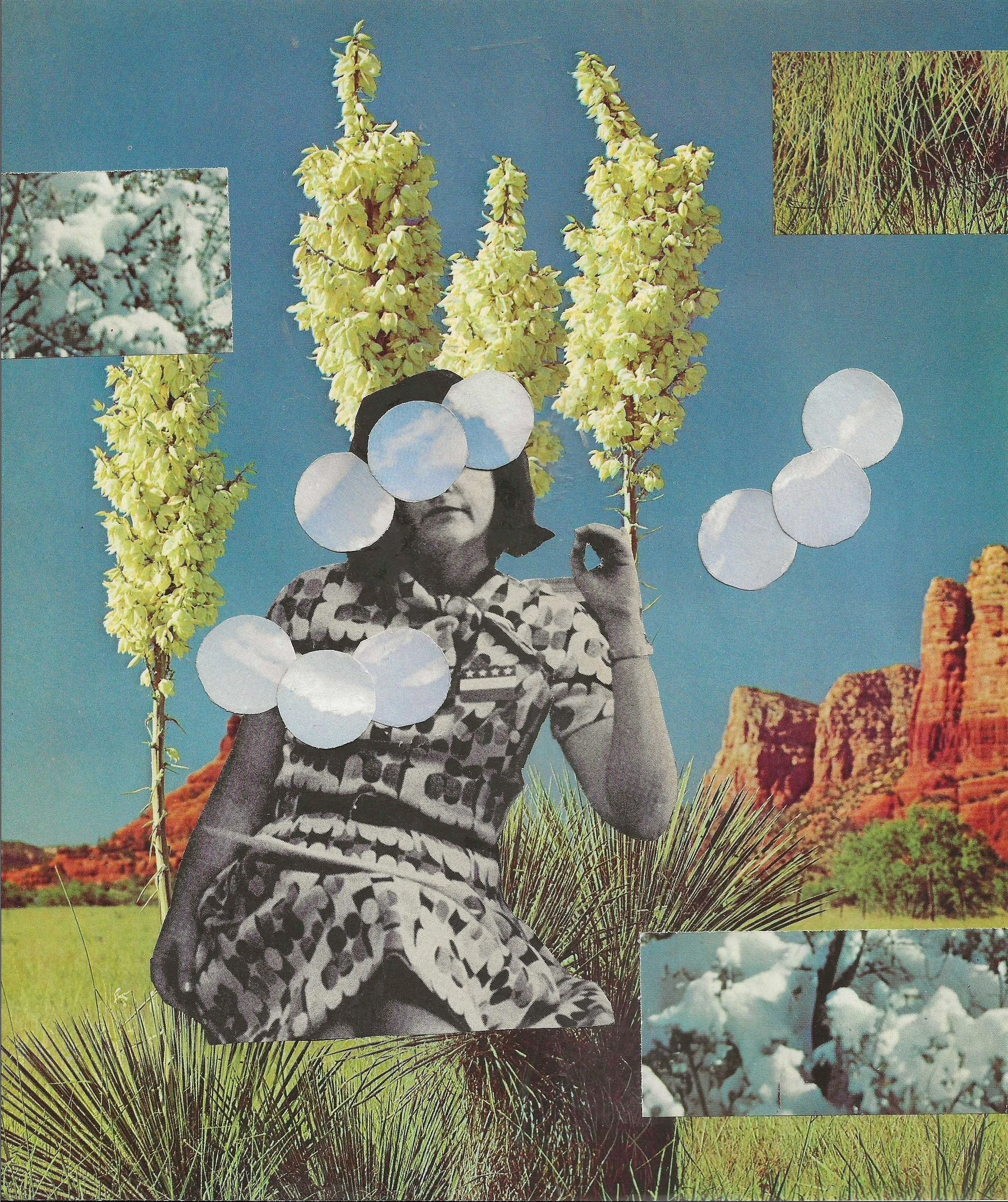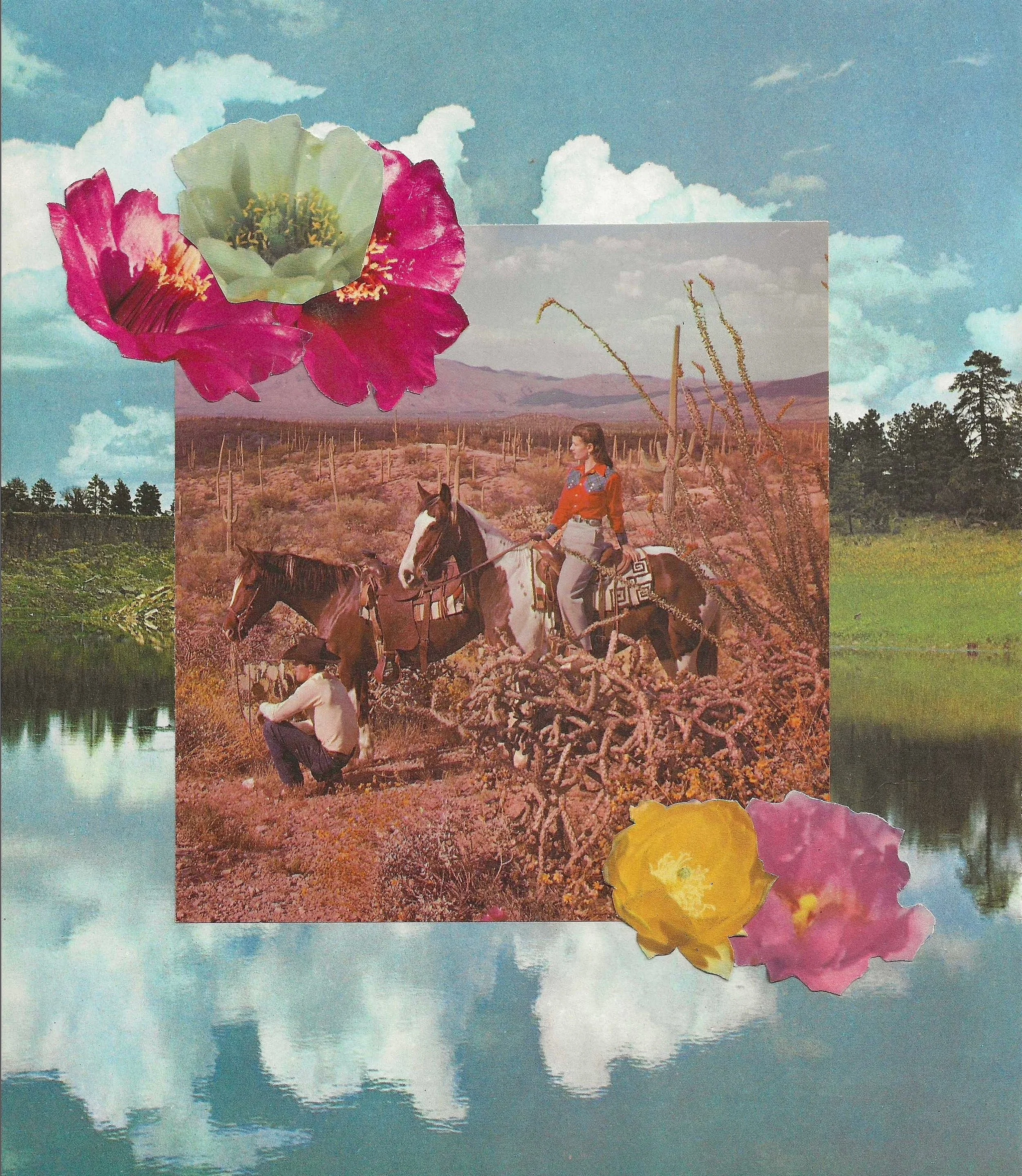 Artist Statement: inspired by midcentury culture and retro ephemera, my collage work explores femininity and self-discovery against the backdrop of the American Southwest. I often pull the women depicted in my works from vintage advertisements and magazines that perpetuate negative stereotypes around women’s value and role in society. Against open skies, scenic landscapes, and the natural world, I hope to free these figures and offer them an altered legacy.